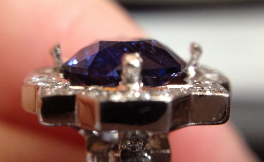 It was at this point where we realized that a color-shifting sapphire I had at the time would fit very well into this setting with minor modifications, essentially rebuilding and thickening of the prongs that already needed to be retipped. That was that.