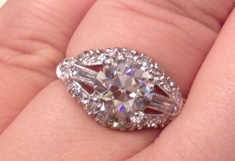 I don’t particularly like fishtail prongs, but between the beautiful center stone and the french cut sides, this ring really wanted to come home with me.