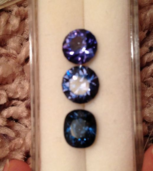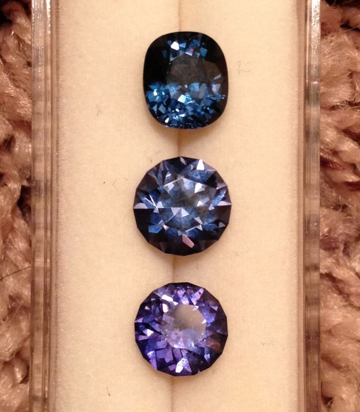 The dark blue spinel on the bottom is showing a bit of extinction, while the stones above it (sapphire and spinel, respectively) are not.