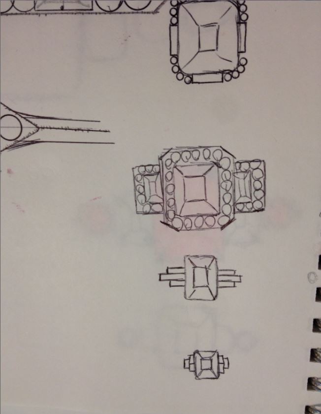 This was a fairly awful sketch because the outline of the stone is so way off, but it was more to get a feel for the general idea. Drawing is so hard for me to do well, and I have to spend a lot of time working on it. Drawing abnormal shapes are hard. Circles and squares are great, but throw in cushions or any cut corners and I’m screwed.