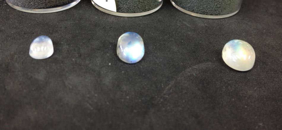 These were three stones that I pulled for my friend. I preferred the left oval for her, but went out on a limb with the right oval. She wasn’t looking for a moonstone that showed a full rainbow, just wanting one that showed blue. So the right was dismissed almost immediately.