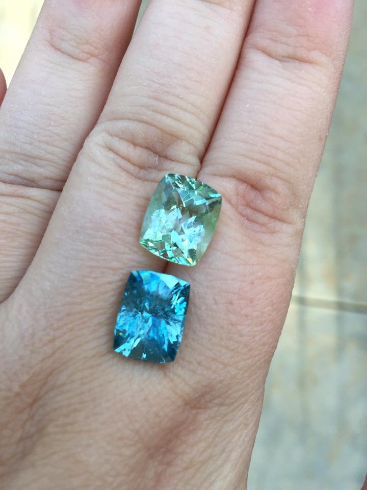 Two unheated 5ctish Aquas. Blue is precision cut, green is not. Both are glorious in their own ways!