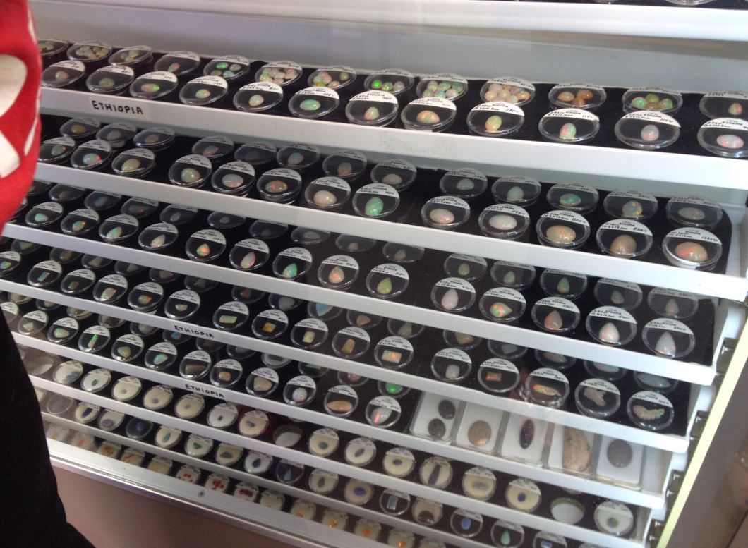 This is the opal case. Each one of the shelves you see rotates around in the case, dangling somewhat precariously, in a rotating case. In the event that one flips over, the whole case has to be disassembled to get the items that fall to the bottom. Which is why children are not allowed to play with the buttons, and you have to be super careful with them. From this angle, you can see about 1/2 of what’s in this case.