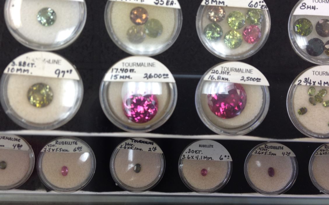 A view of part of the shop – the case closest to the the camera is full of tourmalines, farther away is a case of topaz, two cases of garnets, a case of emeralds and diamonds, citrine and a few more that I can’t remember. All of these cases are full of faceted gems. The cases you can see in the top right corner are actually mineral specimens. These two rows of cases house most of their faceted gems. So you can see that there are thousands and thousands of gems in this tiny store. To the left is actually the biggest part of the store, which houses more minerals, jewelry findings, jewelry settings, cabochoned material, carvings, gemstone and mineral display boxes, etc.
