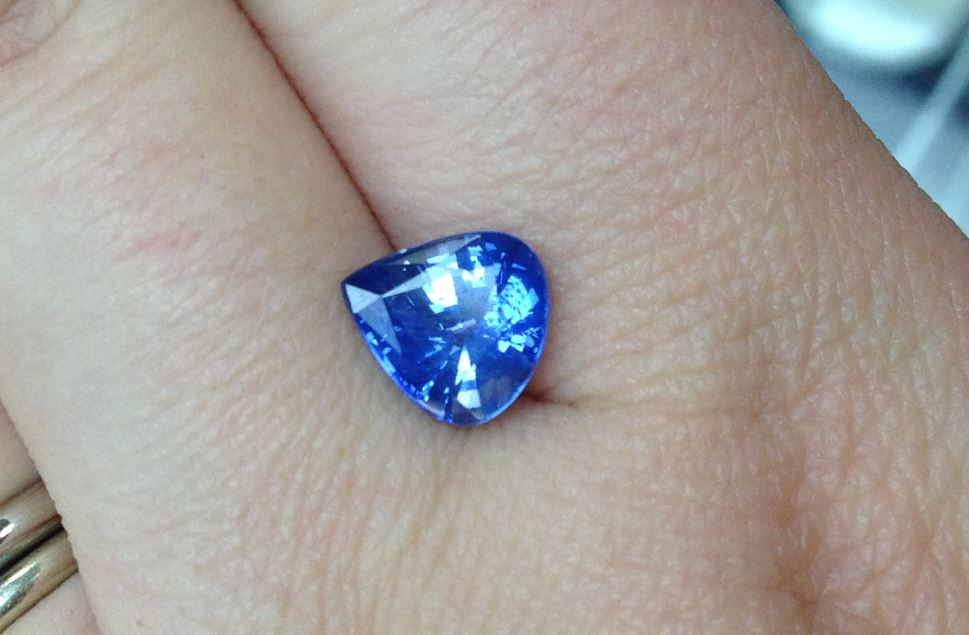A gorgeous blue sapphire pear. I’d almost call this a cleft-less heart, but not quite there. The colors of these stones are not quite accurate until you pull them out of the case. Looking at them through a layer of glass and a layer of plastic plus the glare of the light on both really affects the colors.