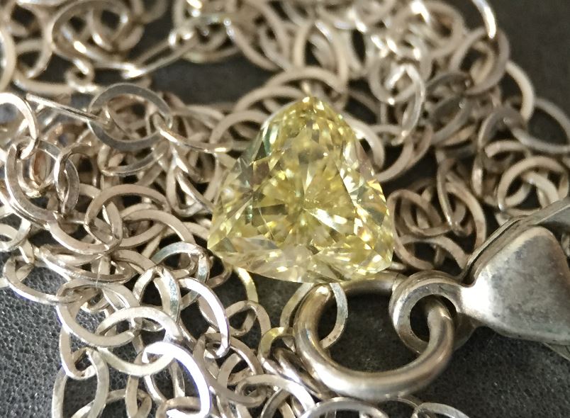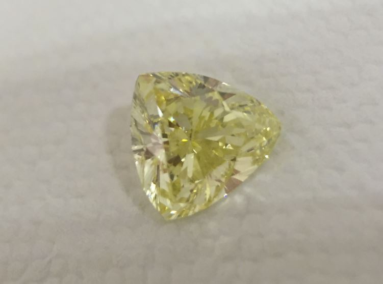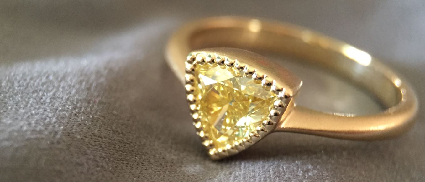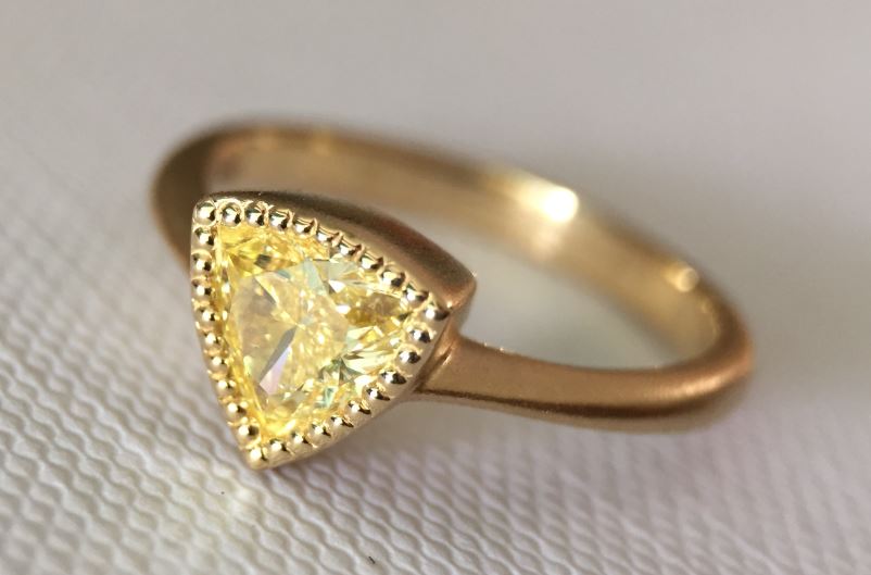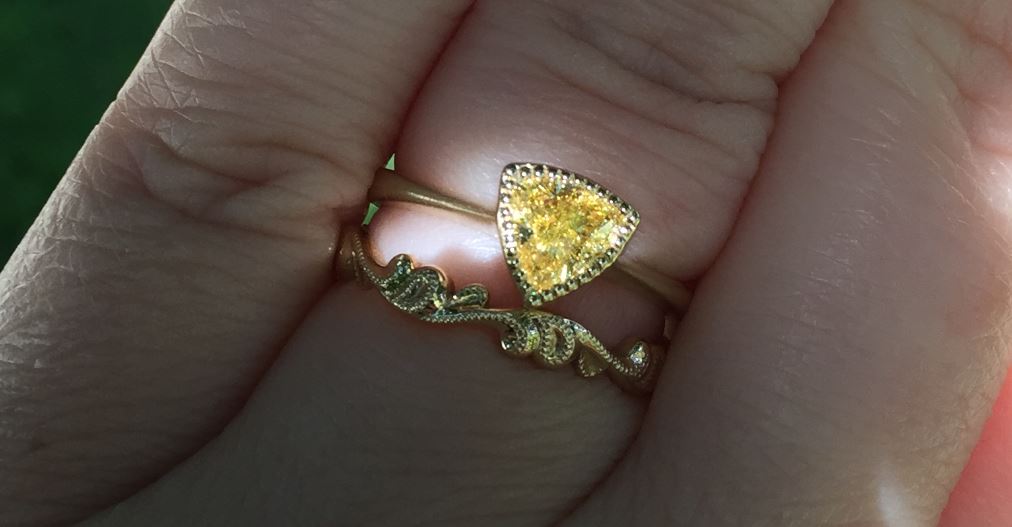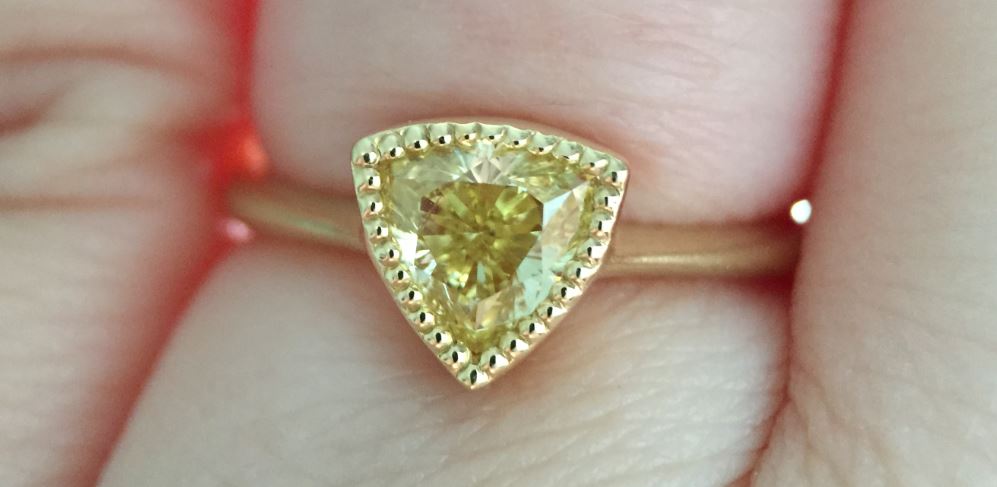 Once upon a time I really wanted a trillion shaped engagement ring. That was back when I was a teenager if I remember correctly. I ended up with a round brilliant that I basically picked out for myself, so obviously teenage dreams of a trillion didn’t exactly happen. But since then, I’ve always been cautious about trillions, because they were asymmetrical and I have weird issues with asymmetry. Until I met this Fancy Light Yellow diamond.