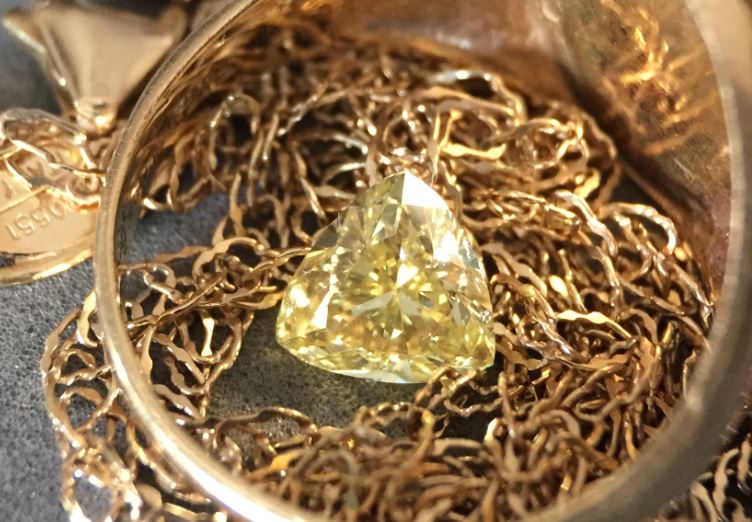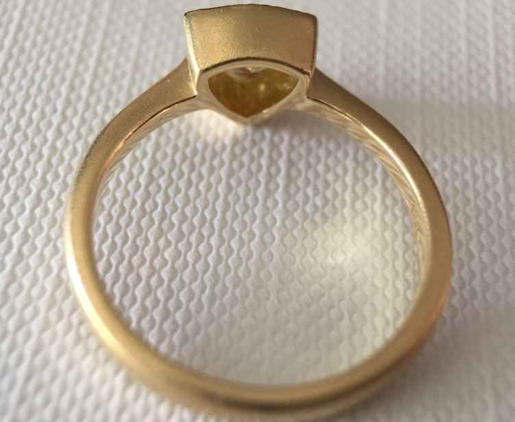 I had it set in a 18kt yellow gold bezel to enhance the color as much as possible. I wanted something simple, and adding a halo of white diamonds (how I think yellow diamonds are usually set) took attention away from the richness of the color. Plus, for items that end up in my personal collection, I prefer to stay away from halos.