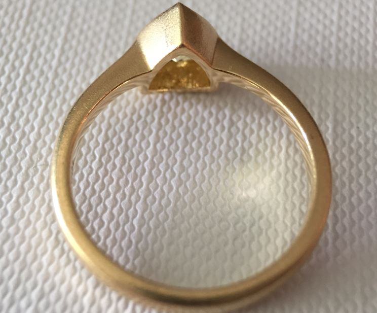 Really, when it comes down to choosing metal colors, even though I don’t wear a lot of yellow gold, it’s all about doing the best you can to compliment the stone. On this one I wanted to enhance the yellow as much as possible, and I think my goal was accomplished, since it looks far more vibrant now that it’s set than it did before when it was loose.