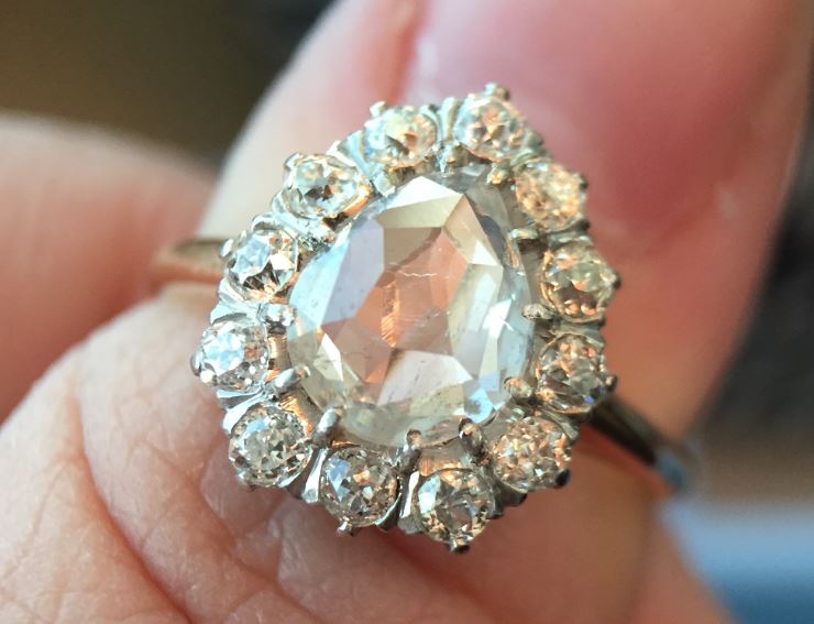 Luckily, being one of the first people there has it’s perks, like I didn’t feel guilty about grabbing people’s bling as soon as they walked in the door, since no one else was there to look at it yet. For instance this amazing pear rose cut came through the door, and I didn’t want to give it back. I mean, look at it! I think that Jewels By Grace still has it, but it may have sold already. Unfortunately, not to me.
