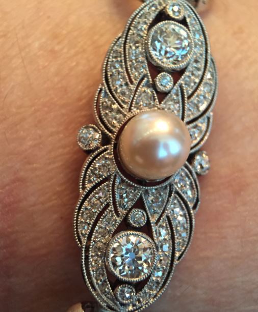 This piece is wonderful, first of all because it belongs in a friend’s personal collection, but also because of the history. It’s a 1920s Art Deco brooch that was converted in the 1950s into a bracelet. I didn’t capture the bracelet details, but the brooch part is absolutely immaculate with perfect milgrain.