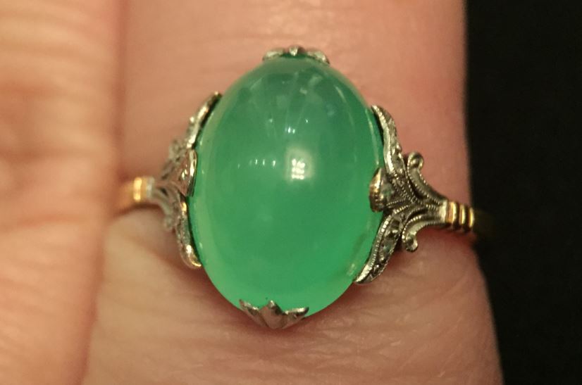 Another wowza item that is a bit shy and not fond of the bling paparazzi is a stunning antique green chrysophase ring. This thing has presence in any room, and glows like it has a light on inside. From another personal collection.