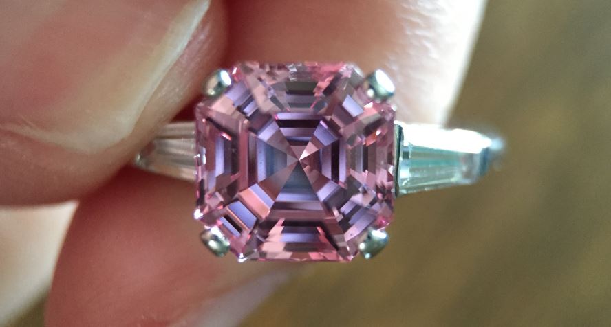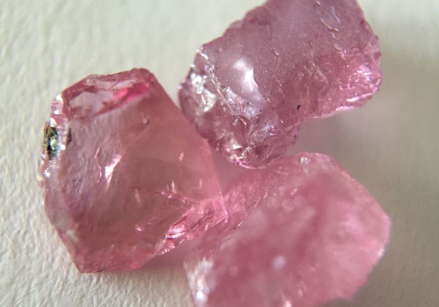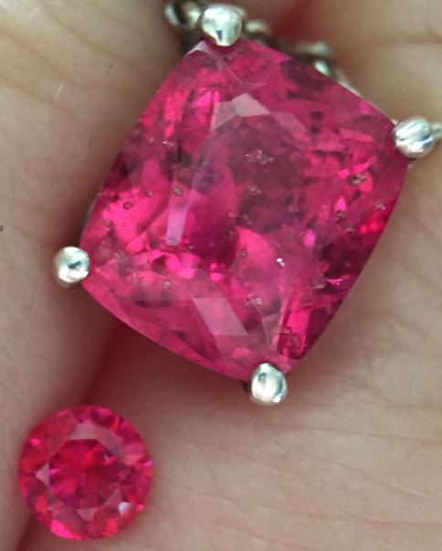 A couple of spinels. The top is from Mahenge Tanzania, and the bottom is from Burma. The top is more reddish pink, the bottom is more pinkish red. Both have the neon glow that is considered ideal in the industry.