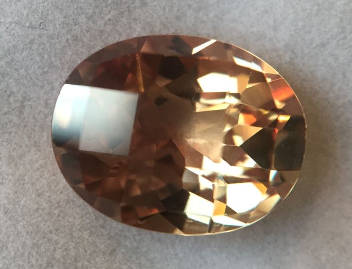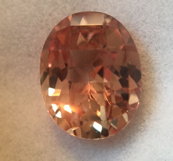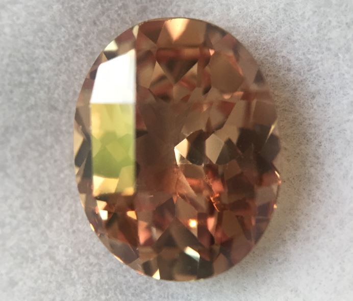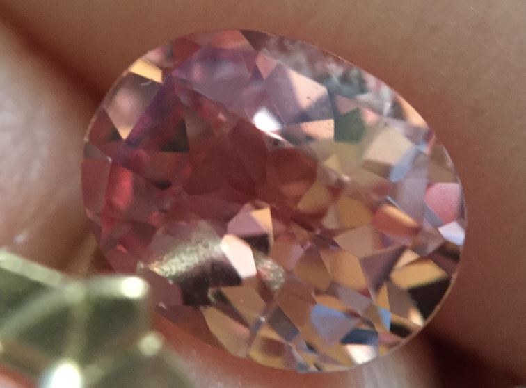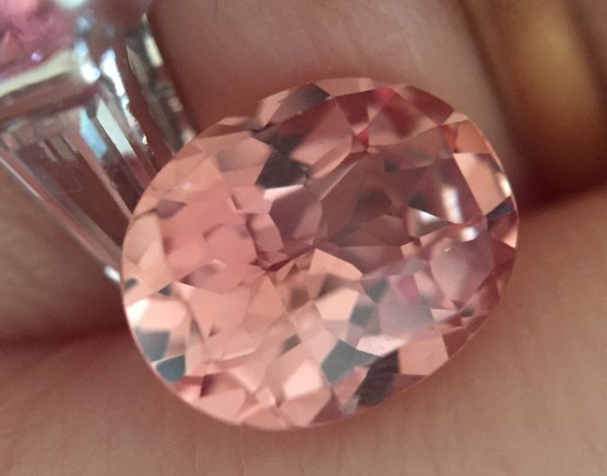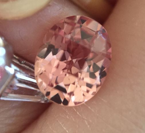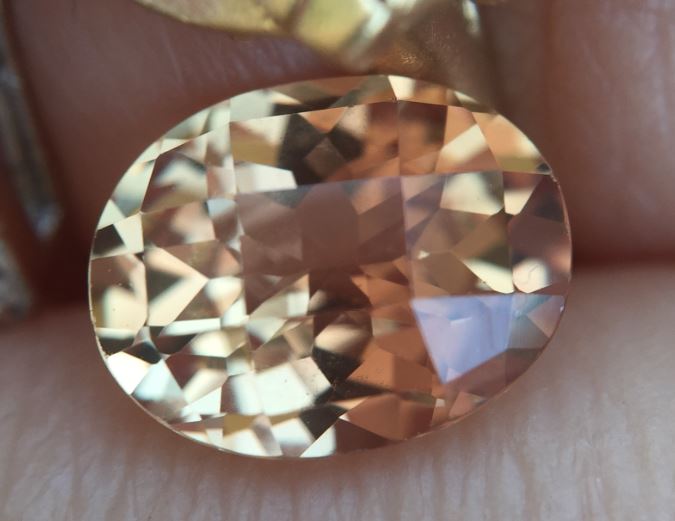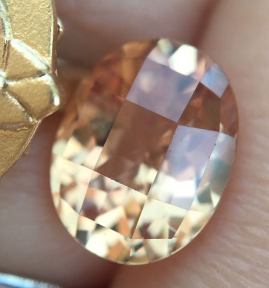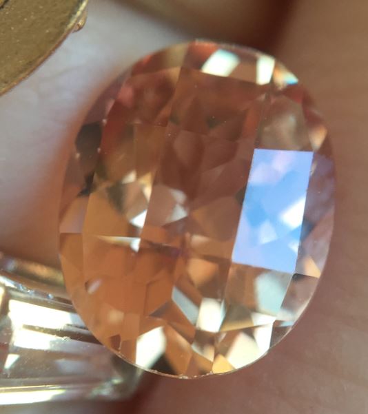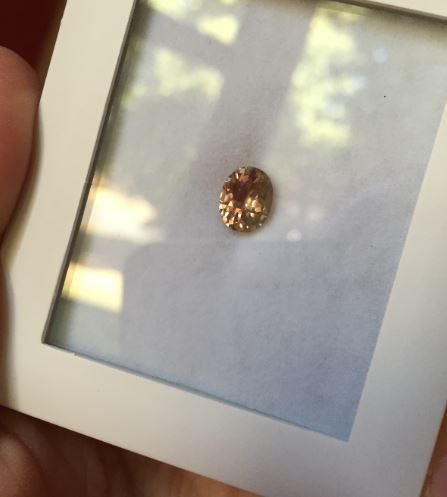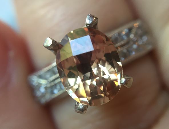 So. The last picture in the gem box is what I saw when I opened the package. It was different enough that I was taken aback – wasn’t this supposed to be a pink-peach sapphire? Did I get the wrong stone? So I took it all over my house, including outside where it turns a champagne/gold in the natural lighting, and inside, in a peach room where it looks peachy brown, and in a pink room where it looks more pink-peach.