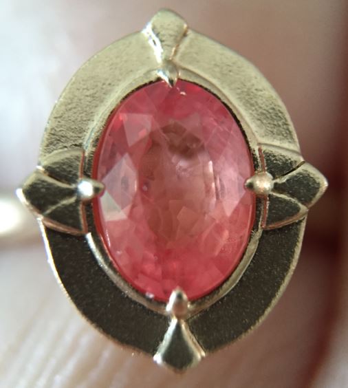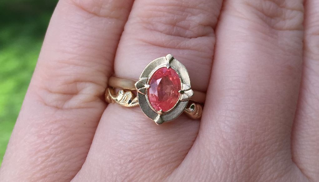 I designed the Aurore setting around a padparadscha sapphire I have had for a while, but could never figure out how to set. The stone has a big window in the middle of it due to insufficient depth. Diamonds don’t typically have that problem, it’s a uniquely colored stone issue. The stone has an amazing color, though, and obviously the best was made of the material by the cutter. It also has some inclusions in it, which give it more of a glow and less of a sparkly bomb.