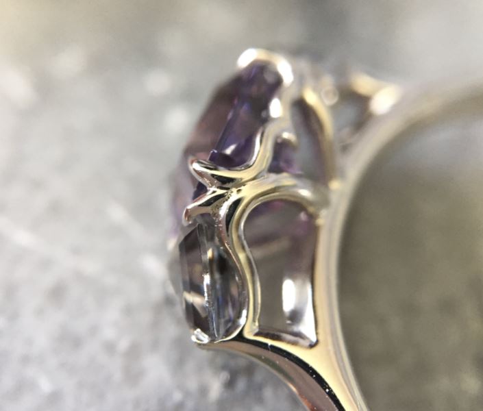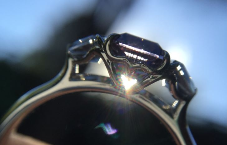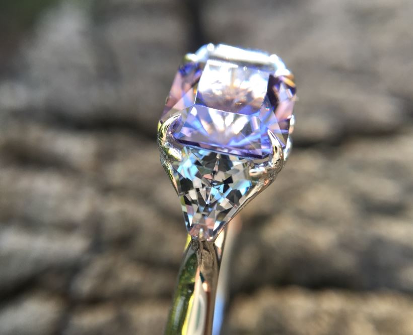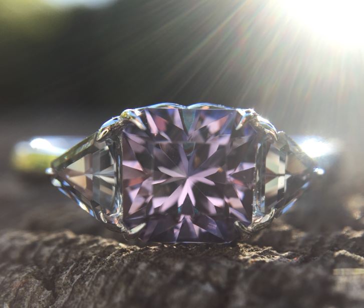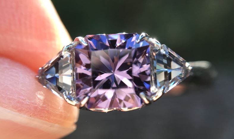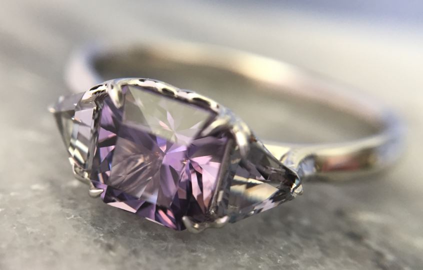 It was made using three precision cut spinels – the center is a lavender spinel, and the two side stones are gray spinels.
