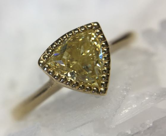 Who said that diamonds had to be white?! This yellow sparkler is bezeled in yellow gold, making it appear even more yellow than it’s grade from EGL, and it gives the face up appearance close to that of a 1.5ct princess diamond. It would make a fantastic buttery engagement ring for the bride who loves yellow or who wants something unique.